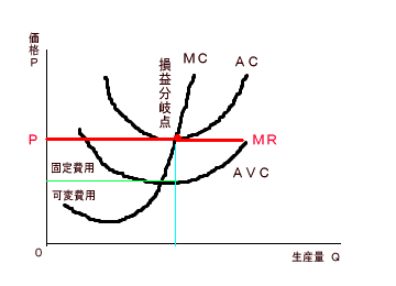 | 損益分岐点 | 平均費用=限界費用=価格 |