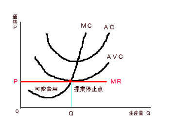 | 操業停止点 | 平均可変費用=限界費用=価格 |